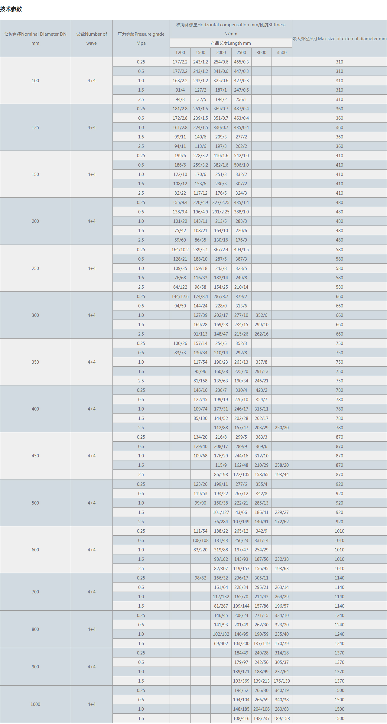 公稱直徑Nominal Diameter DN mm 波數Number of wave 壓力等級Pressure grade Mpa 橫向補償量Horizontal compensation mm/剛度Stiffness N/mm 很大外徑尺寸Max size of external diameter mm