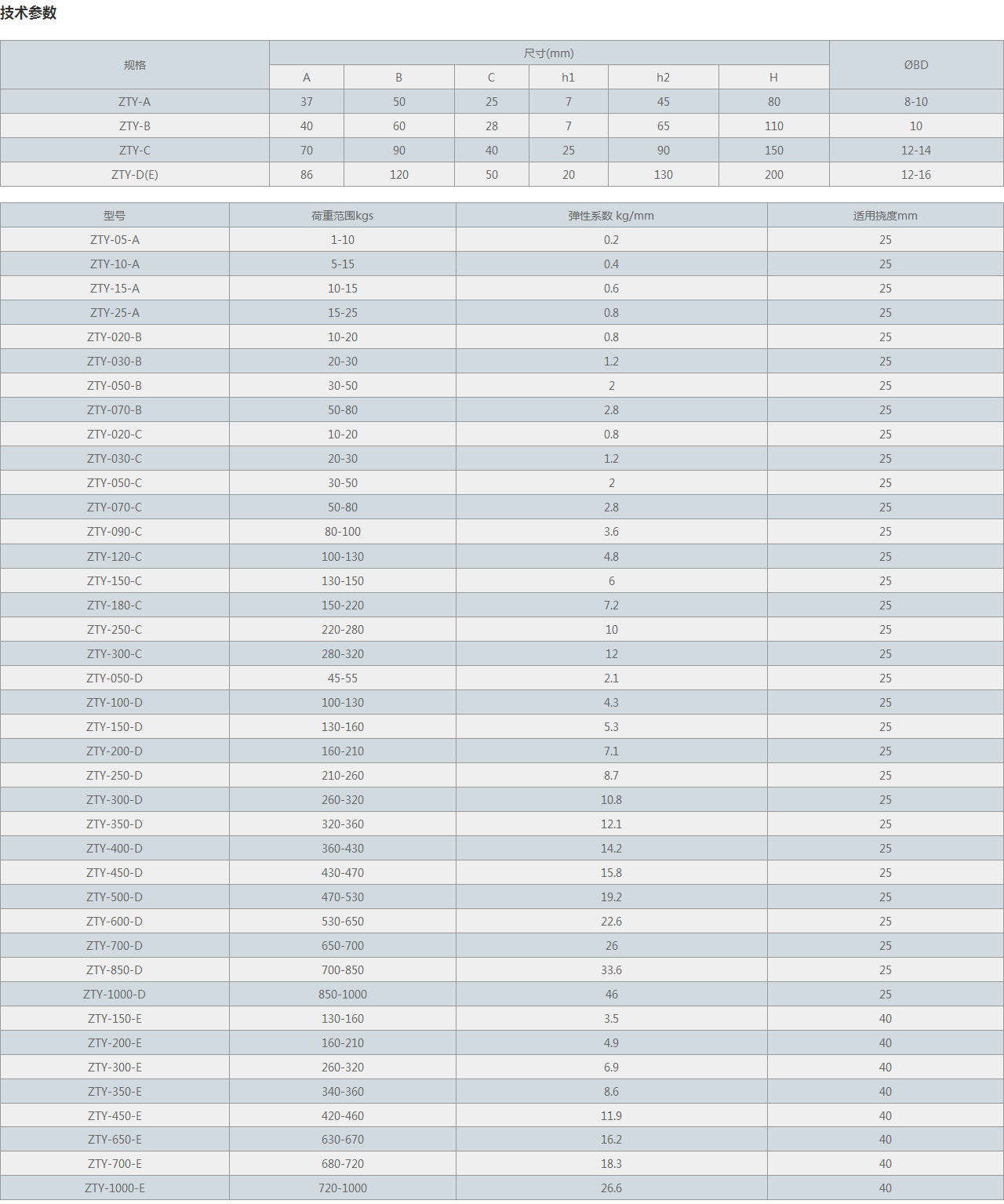 2、ZTY結構簡單,為了保證ZTY彈簧減震器彈簧的運行穩定,很佳荷載為預壓承載上下40%。所以一定要根據設備的實際重量來選擇相對應的ZTY彈簧減震器型號,這樣才能是產品性能很大程度的發揮。