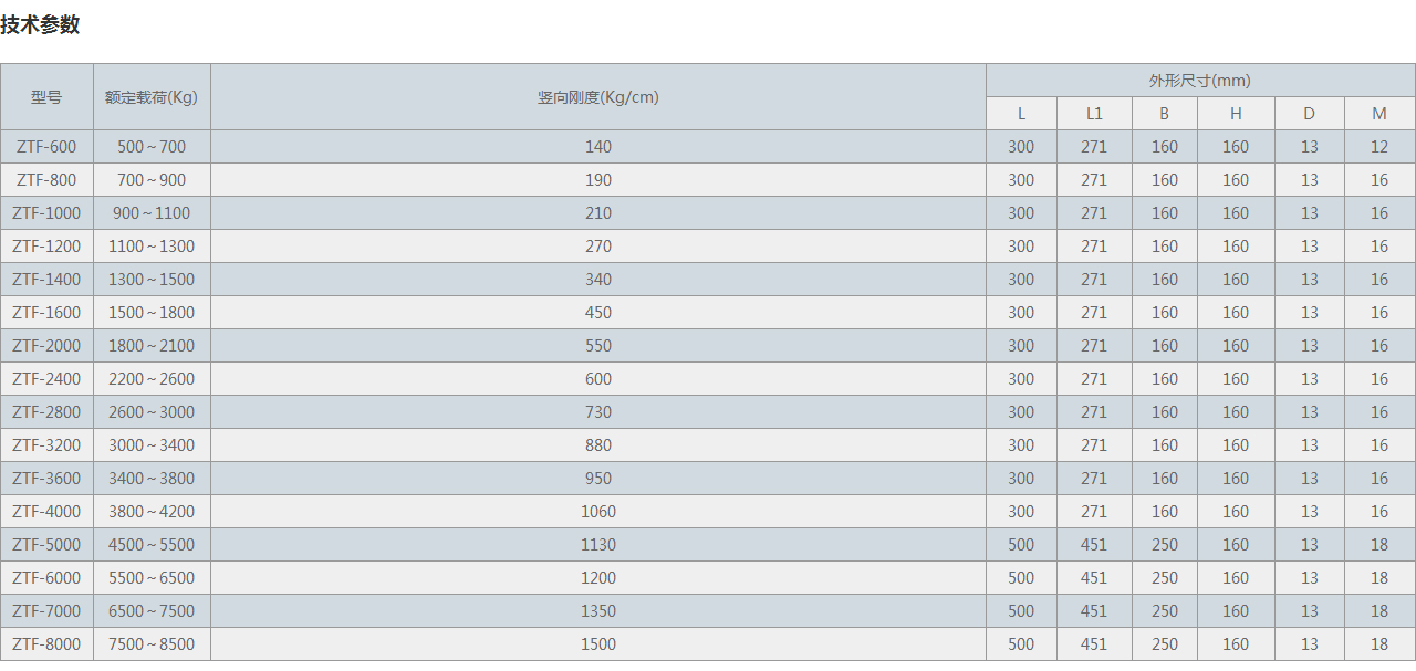 | 型號規格 | H(mm) | L(mm) | W(mm) | L1(mm) | W1(mm) | A(mm) | B(mm) | 適用撓度 | 固定螺栓 |