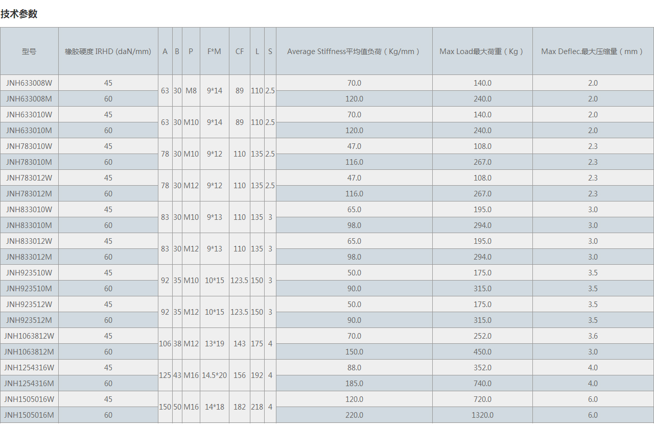 2、結構簡單,安裝方便,為了保證JNH橡膠避震器彈簧的橫向穩(wěn)定,很佳荷載為預壓承載上下40%。