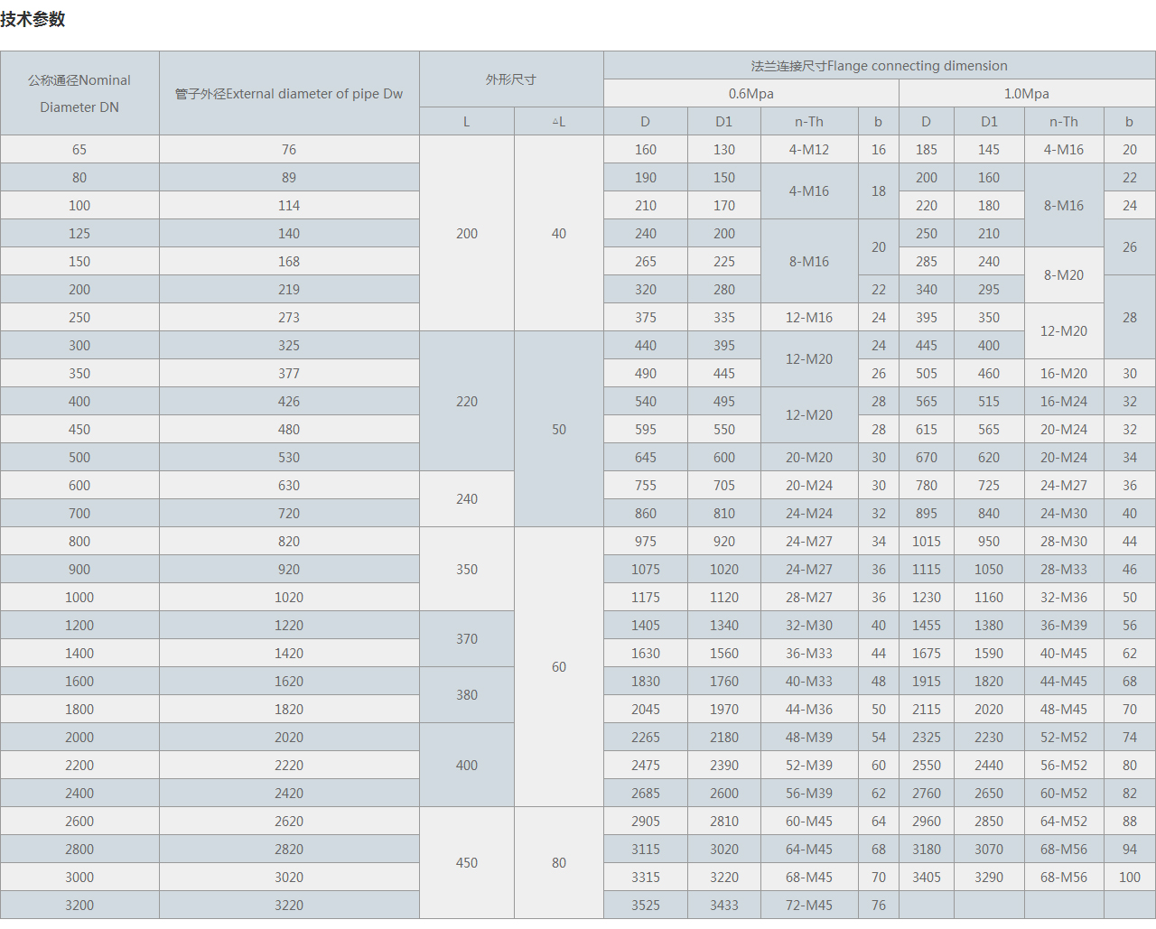 | 公稱通徑Nominal Diameter DN | 管子外徑External diameter of pipe Dw | 外形尺寸 | 法蘭連接尺寸Flange connecting dimension | ||||||||