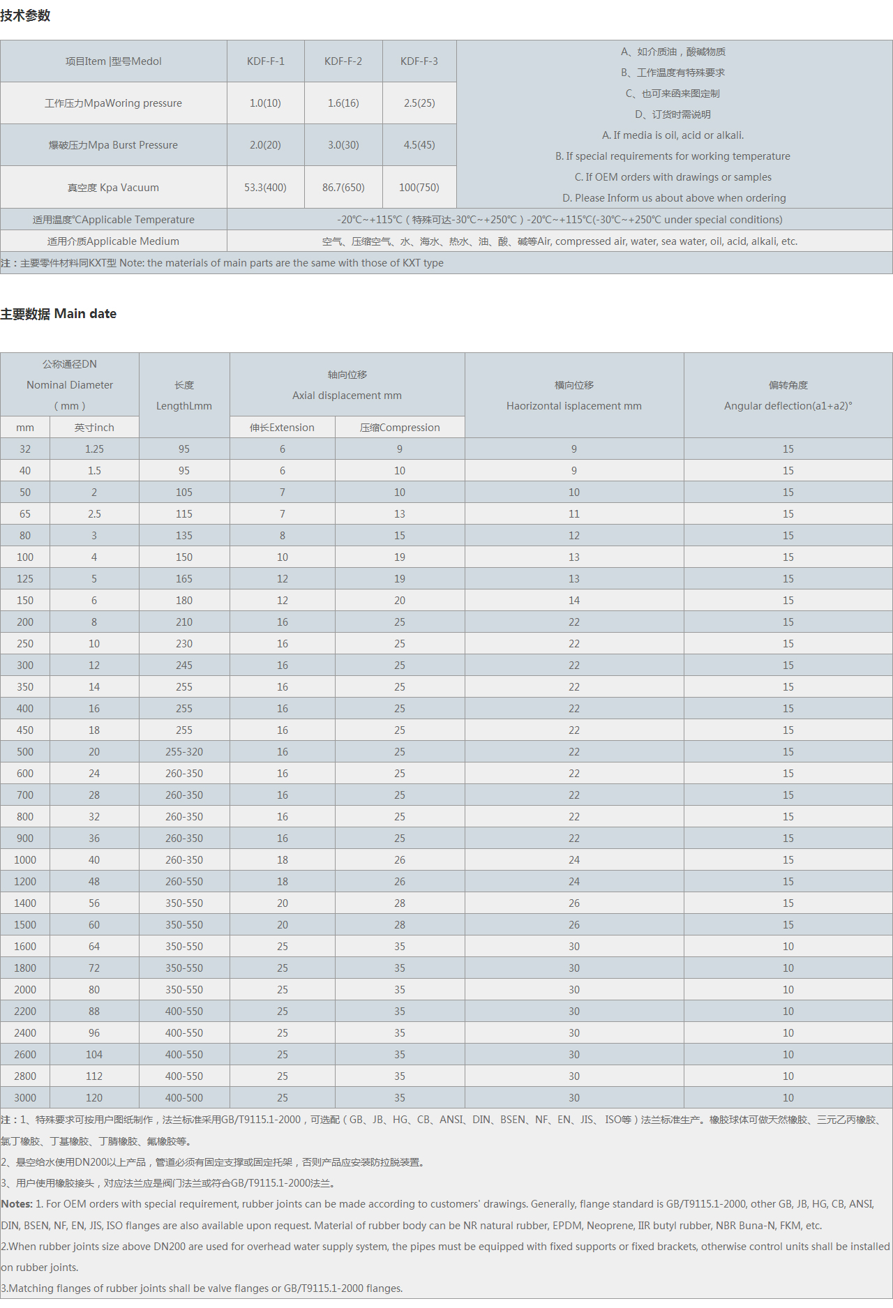 | 注:1、特殊要求可按用戶圖紙制作,可選配(GB、JB、HG、CB、ANSI、DIN、BSEN、NF、EN、JIS、 等)法蘭標(biāo)準(zhǔn)生產(chǎn)。橡膠球體可做天然橡膠、三元乙丙橡膠、氯丁橡膠、丁基橡膠、丁腈橡膠、氟橡膠等。 2、懸空給水使用DN200以上產(chǎn)品,管道必須有固定支撐或固定托架,否則產(chǎn)品應(yīng)安裝防拉脫裝置。 3、用戶使用橡膠接頭,對(duì)應(yīng)法蘭應(yīng)是閥門(mén)法蘭。 Notes: 1. For OEM orders with special requirement, rubber joints can be made according to customers' drawings. Generally, flange standard is , other GB, JB, HG, CB, ANSI, DIN, BSEN, NF, EN, JIS, flanges are also available upon request. Material of rubber body can be NR natural rubber, EPDM, Neoprene, IIR butyl rubber, NBR Buna-N, FKM, etc. 2.When rubber joints size above DN200 are used for overhead water supply system, the pipes must be equipped with fixed supports or fixed brackets, otherwise control units shall be installed on rubber joints. 3.Matching flanges of rubber joints shall be valve flanges or flanges. |