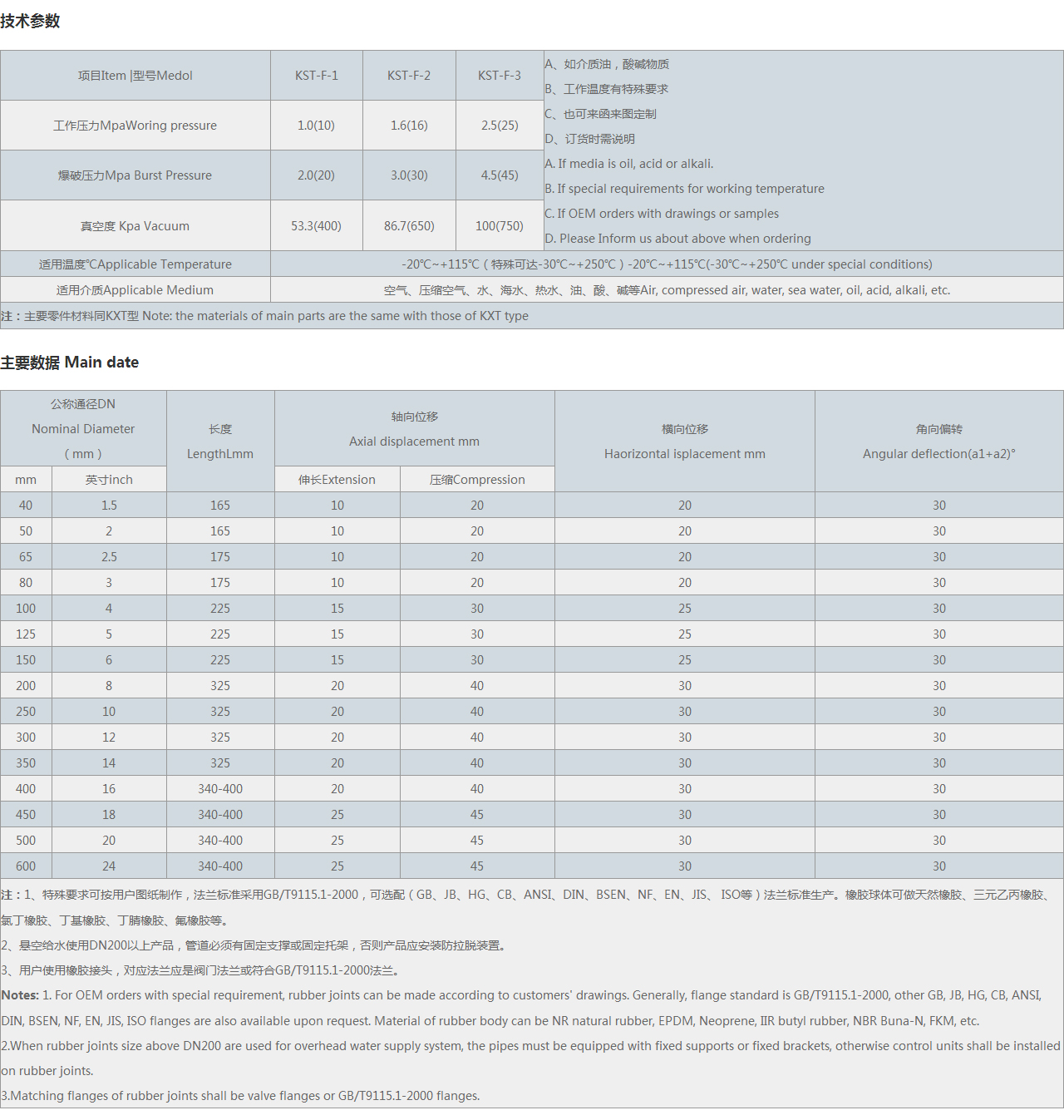 | 注:1、特殊要求可按用戶圖紙制作,可選配(GB、JB、HG、CB、ANSI、DIN、BSEN、NF、EN、JIS、 等)法蘭標(biāo)準(zhǔn)生產(chǎn)。橡膠球體可做天然橡膠、三元乙丙橡膠、氯丁橡膠、丁基橡膠、丁腈橡膠、氟橡膠等。 2、懸空給水使用DN200以上產(chǎn)品,管道必須有固定支撐或固定托架,否則產(chǎn)品應(yīng)安裝防拉脫裝置。 3、用戶使用橡膠接頭,對應(yīng)法蘭應(yīng)是閥門法蘭。 Notes: 1. For OEM orders with special requirement, rubber joints can be made according to customers' drawings. Generally, flange standard is , other GB, JB, HG, CB, ANSI, DIN, BSEN, NF, EN, JIS, flanges are also available upon request. Material of rubber body can be NR natural rubber, EPDM, Neoprene, IIR butyl rubber, NBR Buna-N, FKM, etc. 2.When rubber joints size above DN200 are used for overhead water supply system, the pipes must be equipped with fixed supports or fixed brackets, otherwise control units shall be installed on rubber joints. 3.Matching flanges of rubber joints shall be valve flanges or flanges. |